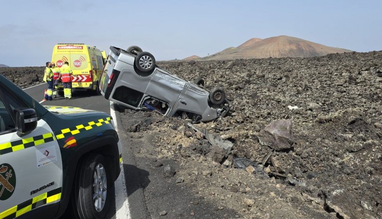 Denne varebilen havnet på taket på veien LZ-67 i Tinajo torsdag ettermiddag. Sjåføren måtte ha hjelp for å komme seg ut av bilen, og ble kjørt til sykehuset i Arrecife for medisinsk behandling, skriver lokalavisen La Voz de Lanzarote.