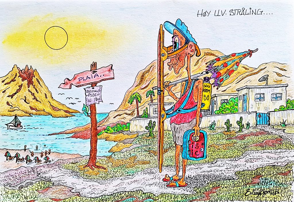 Vår hustegner Erling bruker solkrem med faktor 50, som beskytter deg mot 98 prosent av de farlige strålene fra solen!
