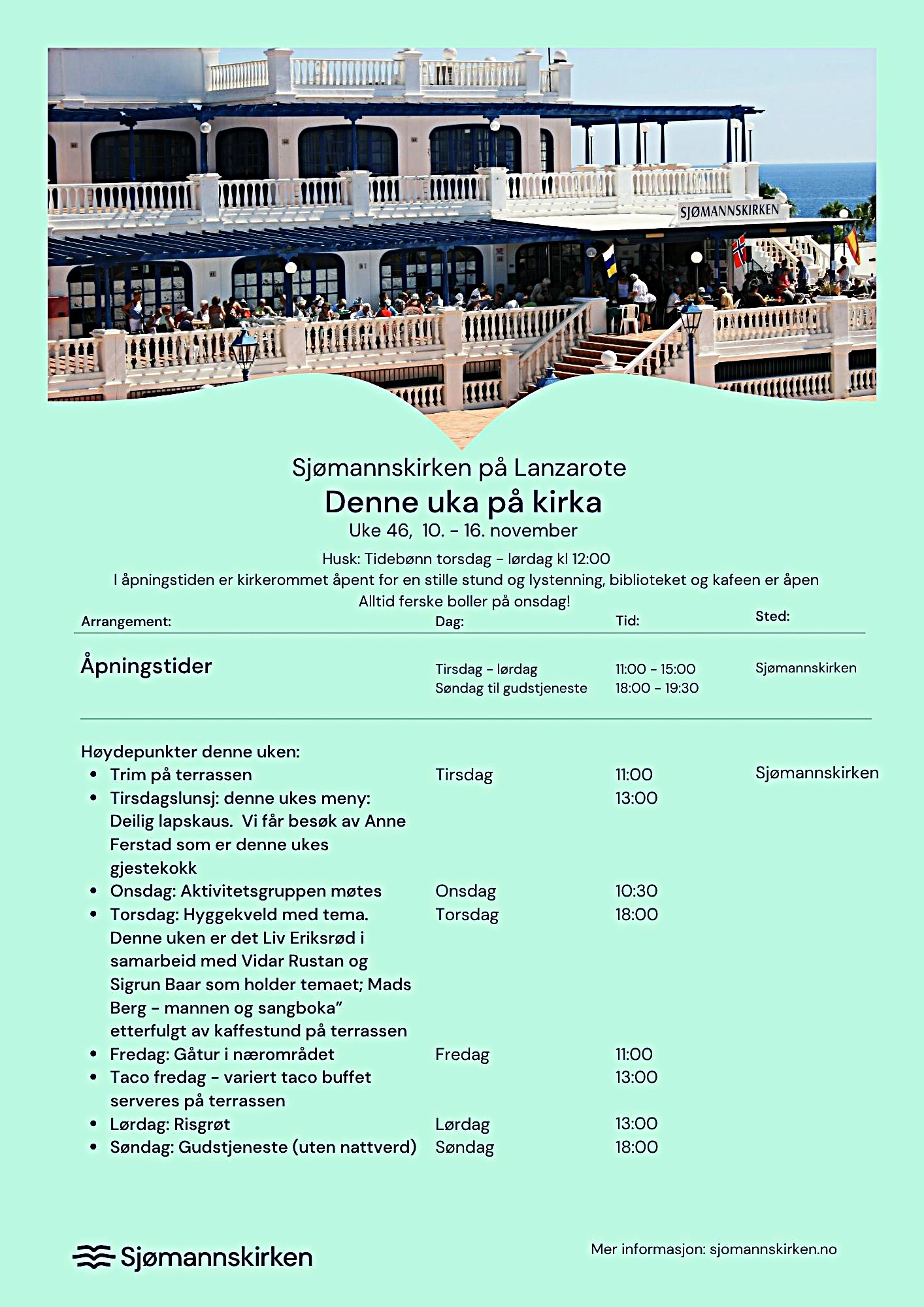 Sjømannskirken på Lanzarote ligger i Puerto del Carmen, nedenfor TUI-hotellet Cinco Plazas. Gå til høyre for HiperDino-butikken. Kirken er godt skiltet. Kontaktadresser finner man HER.