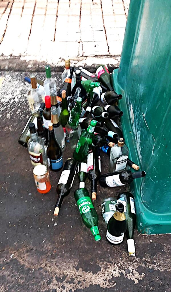 Derfor har folk begynt å sette fra seg tomgodset sitt utenfor konteineren. Nå er det drikkeforbud i nabolaget, for sånn kan vi jo ikke ha det!