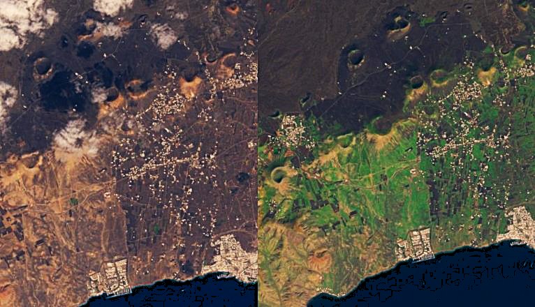 Lokalavisa La Voz de Lanzarote har satt sammen to bilder, som virkelig viser før og etter! Bildet til venstre er tatt 2.desember i fjor, bildet til høyre er tatt 26.januar: