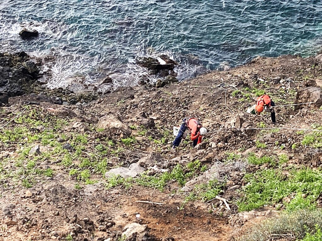 Forleden dag vi så tre menn som hang i stropper og tau i den bratte skråningen ned mot havet etter sikk-sakk trappen helt syd i Puerto del Carmen, på veien som går mot Puerto Calero.