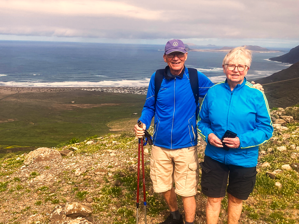 Anna og Øystein Rismo fra Målselv hadde kommet seg opp på fjellet for å nyte den fantastisk utsikten. «Norskebyen»på Famara i bakgrunnen: