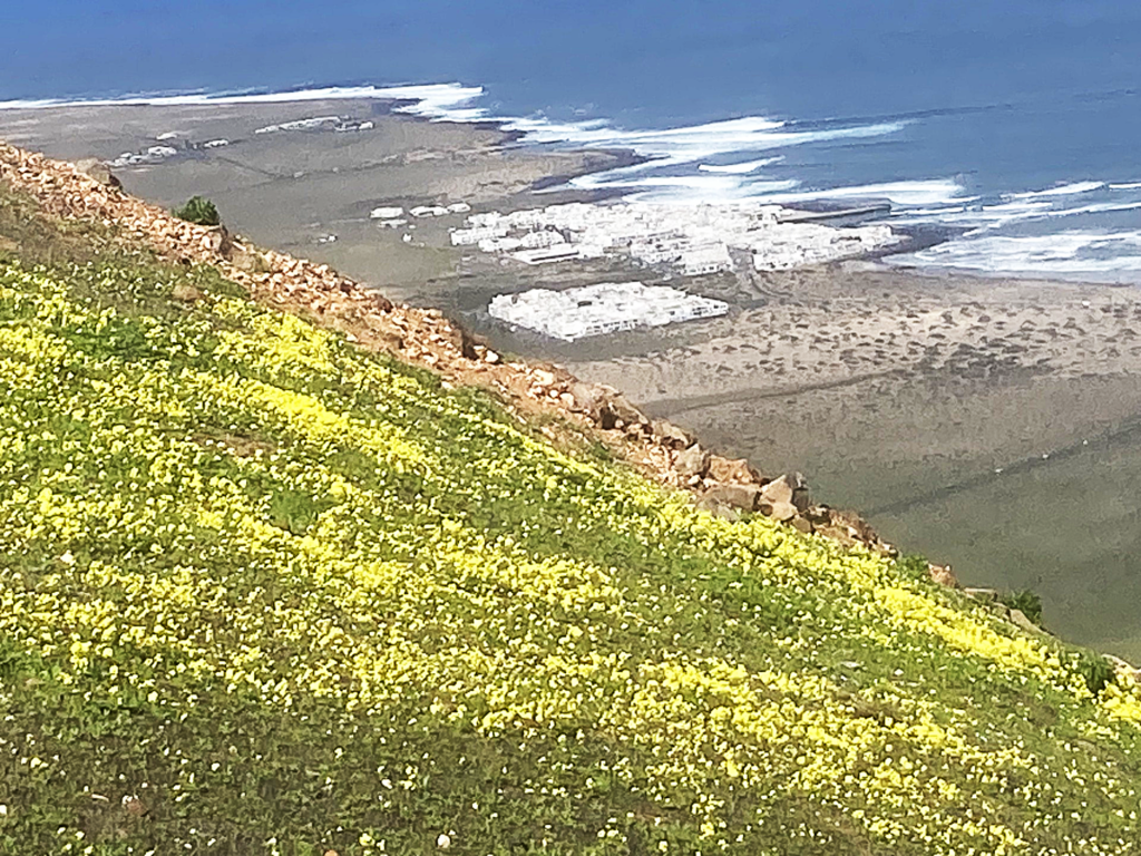 For en utsikt mot «norske-byen» på Famara og selve Famara by! Vi kunne se bølgene slå inn mot Famara-stranden. Vi kunne se til Soo, La Santa og Tinjao. Og kanskje det vi ble mest overrasket over var hvilken blomster-prakt det var her med gule blomster nedover fjellsiden. Fjellet stupte 300 meter rett ned. En fantastisk fin natur, og her hadde vi ikke vært før.